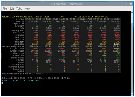 The utility refreshes automatically every few minutes to keep the information up-to-date. The same source code src/pilomarmetcheck.py provides the class metcheck_handler() which you can use in other programs if needed.